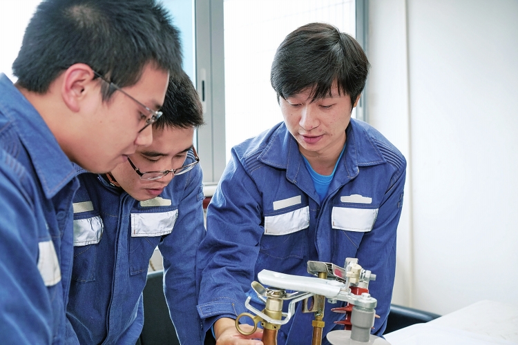 李正強(qiáng)(右一)與創(chuàng)客團(tuán)隊(duì)正在研究和改良帶電合地刀裝置。 劉琳 攝  短短幾年間,創(chuàng)客文化在廣東電網(wǎng)公司佛山供電局青年員工之中蔚然成風(fēng)