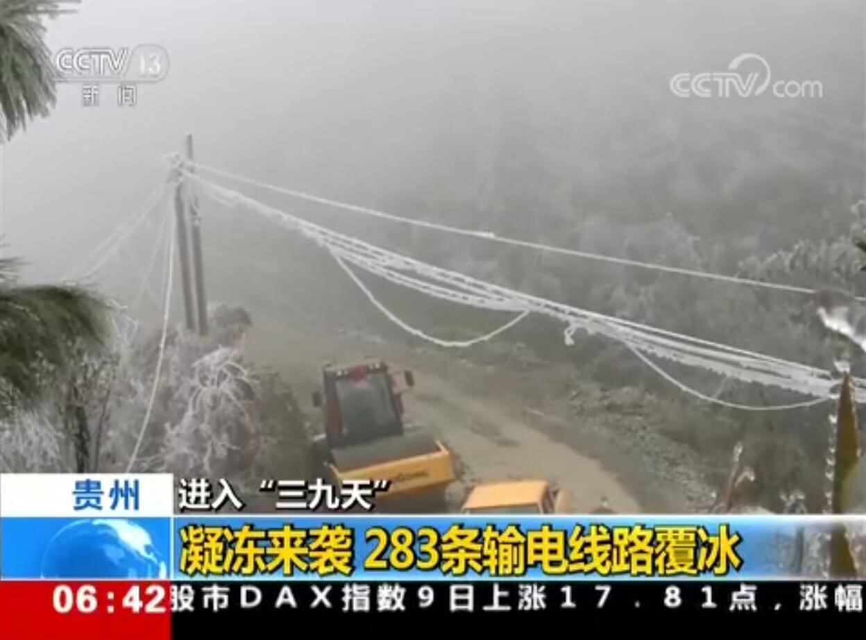 中央電視臺新聞頻道《朝聞天下》欄目在2018年1月10日報道:寒潮來襲,冰凍天氣使一些地方的輸電線路等設(shè)施受到了影響,受影響地區(qū)也都采取了多種措施來應(yīng)對。從2018年1月8日開始,廣東北部地區(qū)出現(xiàn)了供電線路覆冰情況。其中,兩條輸電線覆冰達(dá)到25毫米。此外,貴州地區(qū)有283條線路出現(xiàn)了覆冰情況。為保證安全用電,兩地電網(wǎng)公司均已啟動直流融冰裝置對輸電線路實(shí)施融冰。